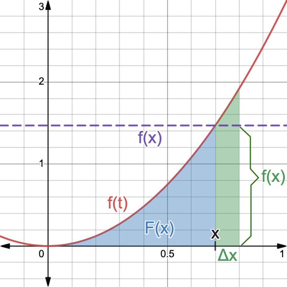 What this means is that the rate of change at which \(F(x)\) changes (the change in \(F(x)\) divided by the change in \(x\)) is equal to \(f(x)\Delta x/\Delta x\), which is equal to \(f(x)\). In other words, the derivative of \(F(x)\) is \(f(x)\). This is important because it tells us that the derivative of an area function gives us the original function, which means that derivatives and integrals are inverses! This fact is known as the Fundamental Theorem of Calculus.