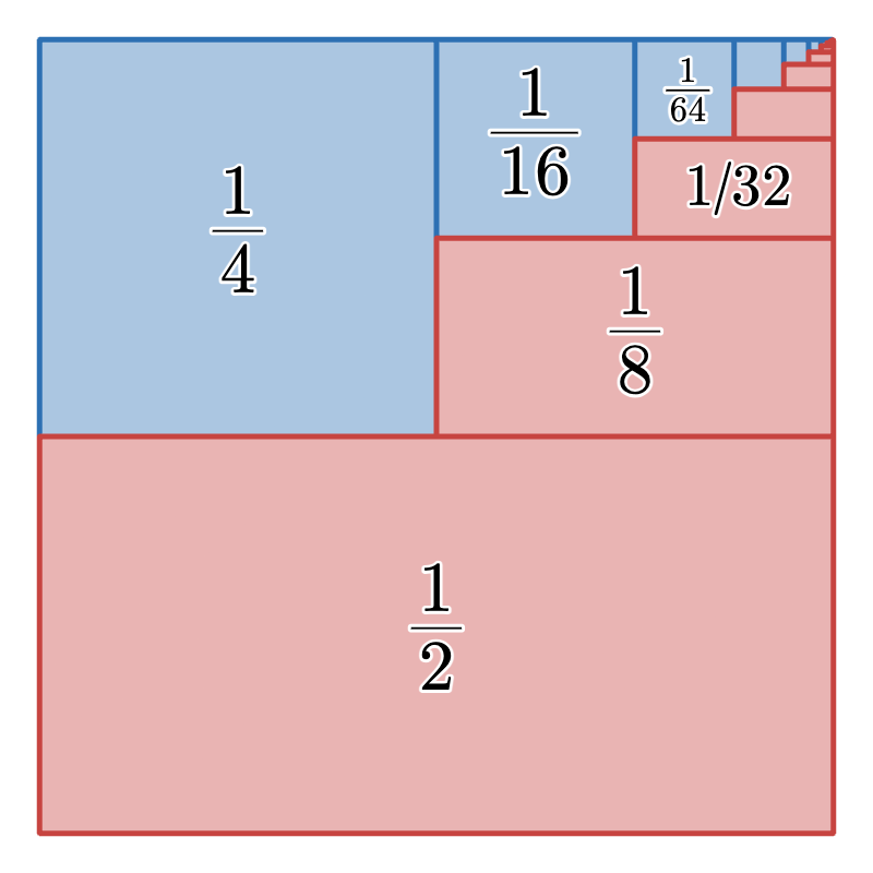 An image demonstrating the summation of this series. The entire square has an area of 1.