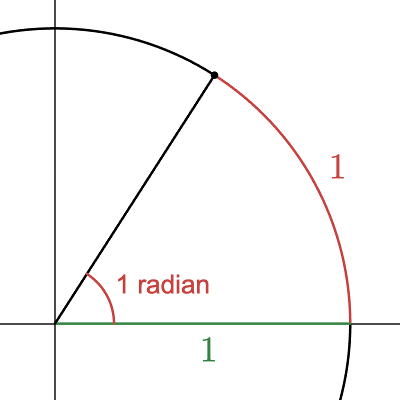 The arc length that subtends \(\theta\) is very close to the value of \(\sin(\theta)\), and this approximation only gets better as \(\theta\) gets smaller and smaller. So maybe it would be useful to design a system of measuring angles that is based on this arc length. We could say that 1 radian is the angle that an arc length of 1 subtends in a unit circle.